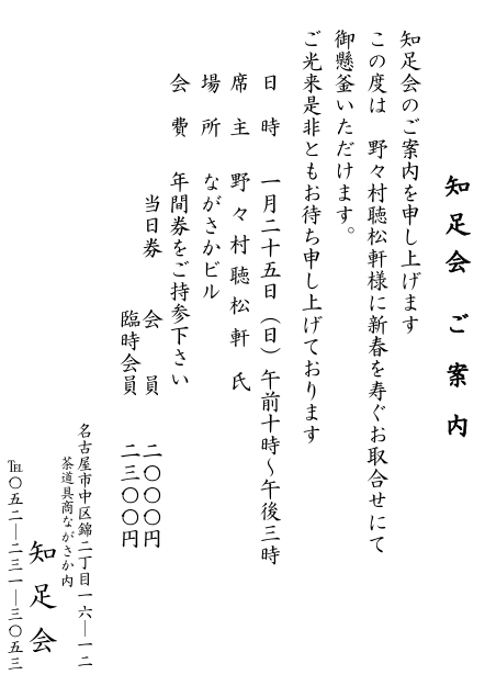 日時 1月25日(日)10時から15時まで 場所 ながさかビル 席主 野々村聴松軒氏